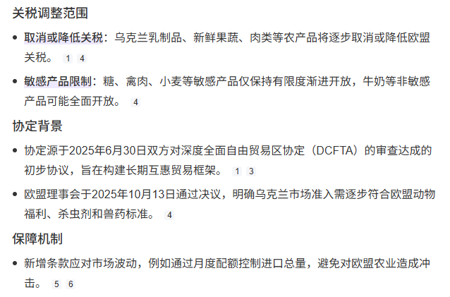 當地時間 10 月 29 日,歐盟與烏克蘭簽署的《深度全面自由貿易區協定》(DCFTA)升級版正式生效,核心內容包括:歐盟對烏克蘭乳製品、新鮮果蔬、肉類等農產品實施關稅減免,部分品類關稅降幅達 100%;引入 “動態保障機制”,當烏克蘭農產品進口量激增時,歐盟可臨時恢復關稅以保護本土產業;要求烏克蘭在 2030 年前全面採用歐盟生產標準(如食品安全、環保法規)。此舉旨在加強雙方經濟綁定,預計到 2030 年將使烏克蘭對歐盟農產品出口額增長 45%。受此影響,烏克蘭葵花籽油、蜂蜜等商品對華出口可能減少,中國企業需關注供應鏈替代方案。
