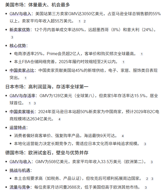 Marketplacepulse 於 10 月 30 日發佈《亞馬遜全球市場潛力報告》,基於收入、流量、競爭度等七個維度評估 11 個核心市場。美國以綜合評分第一穩居榜首,第三方 GMV 達 3050 億美元,賣家平均年收入超 55 萬美元,新賣家 12 個月首單率 60%。日本雖 GMV 僅 128 億美元,但賣家長期存活率 15.5% 全球最高,適合精細化運營的品牌商。德國排名第三,賣家收入在歐洲僅次於英國,且本土合規要求較高,需強化稅務與產品認證。報告指出,市場潛力不能僅看規模,建議賣家根據產品特性選擇細分市場,例如高客單價商品可佈局日本,快消品優先考慮美國。