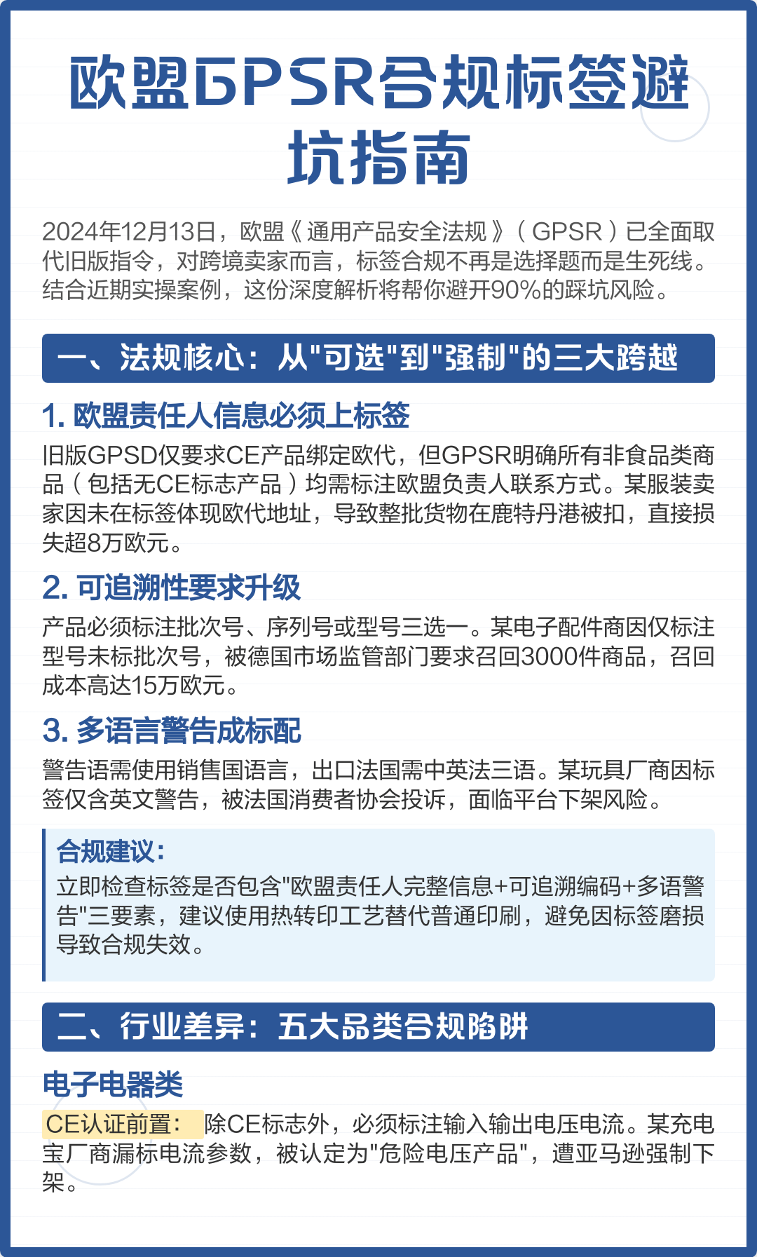 歐盟《通用產品安全法規(GPSR)》將於 12 月 13 日生效,跨境電商平臺今日集中強化合規提醒:亞馬遜要求歐盟站點賣家儘快核驗歐代資訊、GPSR 標籤,未合規商品將被下架;速賣通同步要求投放在歐盟市場的含危險化學品產品,需符合《分類、標籤和包裝(CLP)法規》的包裝與標籤要求,避免清關及銷售風險。