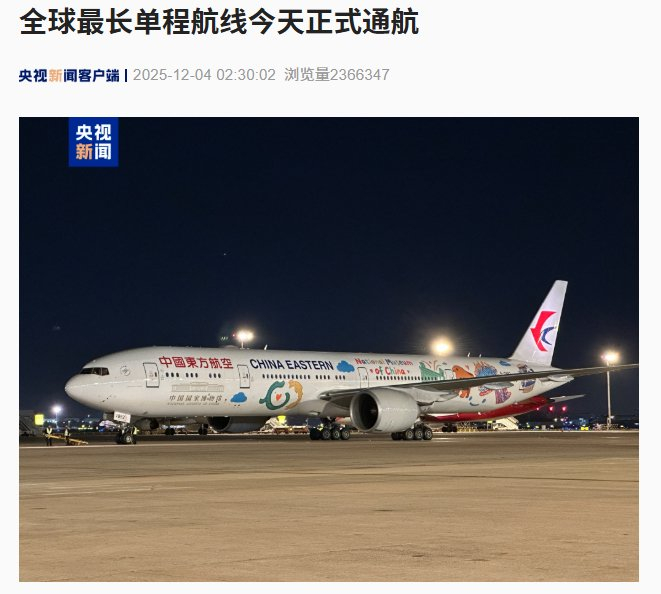 中國東航 MU745 航班首航上海至阿根廷布宜諾斯艾利斯,以約 2 萬公里航程刷新 “全球最長單程航線” 紀錄,較傳統中轉航線耗時縮短超 4 小時。該直航將提升中阿跨境物流效率(預計提效 20%),2025 年前 11 月中阿貿易額已同比增長 18%,直航後阿根廷牛肉、紅酒及中國機電產品等跨境商品往來將更便捷。