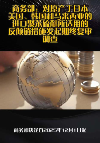 中方宣佈 12 月 1 日起繼續對原產於美國的進口聚苯硫醚徵收最高 220.9% 的反傾銷稅。此舉針對美方企業長期低價傾銷行為,防止其衝擊國內剛起步的高端製造業;目前受高稅率影響,美方相關企業在華市場競爭力已大幅減弱。