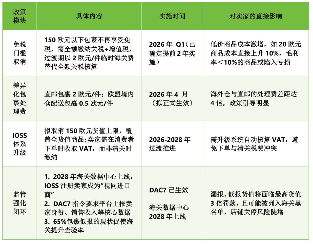 2026 年 1 月 1 日起,歐盟取消 “150 歐元以下包裹免關稅、22 歐元以下免 VAT” 政策,全貨值包裹需繳 5%-12% 關稅 + 15%-27% VAT+2 歐元 / 件直郵處理費;電商平臺成為稅費代扣第一責任人,需核驗賣家合規資訊,違規最高罰 5000 歐元 / 票,低報價包裹清關延誤率超 50%。