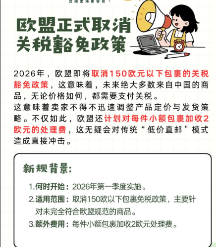 2026 年 7 月起,欧盟将对来自非盟的≤150 欧元低价值 B2C 包裹统一征收 3 欧元固定关税,同时取消原有进口一站式申报的简化红利,颠覆过往合规申报逻辑,直接推高中小跨境卖家的清关与运营成本,尤其冲击以低价小包为主的铺货型卖家。
