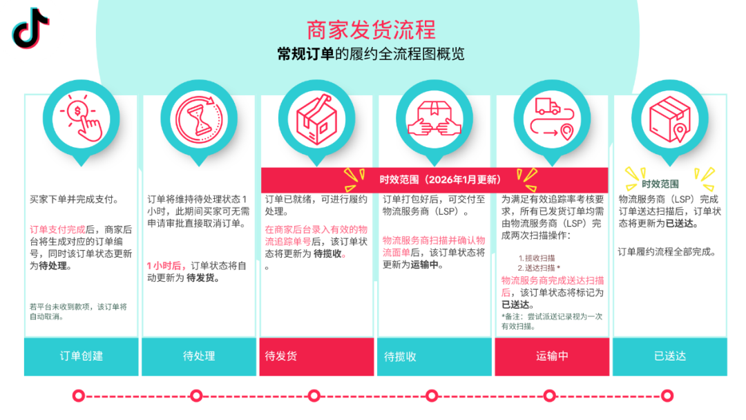 2026 年 1 月起 TikTok Shop(TK)調整履約規則,對發貨時效延遲的處罰分兩階段執行:1 月 12 日 - 25 日為過渡期,1 月 26 日起正式執行,訂單未按要求更新至 “運輸中” 狀態將被判定為發貨延遲,嚴重延遲將面臨平臺處罰,倒逼賣家提升發貨與物流履約效率。