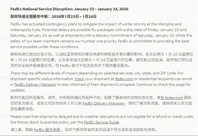 冬季風暴 Fern 席捲美國半數人口區域,導致 USPS(美國郵政)等本土物流服務商的配送網路受阻,包裹分揀、運輸環節大面積延遲;疊加此前美國多港口擁堵與合規審查收緊的影響,中美跨境物流的時效穩定性進一步下降,清關與配送延誤風險持續走高。