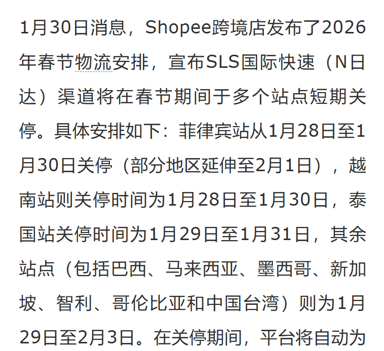 Shopee 跨境店於 2026 年春節期間對多站點 SLS N 日達管道進行短期關停。具體安排為:菲律賓、越南、泰國各有關停時段,其餘站點統一在 1 月 29 日至 2 月 3 日關停。平臺將自動開放其他物流管道,並建議賣家提前調整發貨計畫,避免因物流管道變更導致訂單延誤。此次關停主要是為應對春節期間物流運力緊張和人手不足問題,保障整體物流服務品質。賣家需密切關注各站點通知,及時調整庫存和發貨策略。