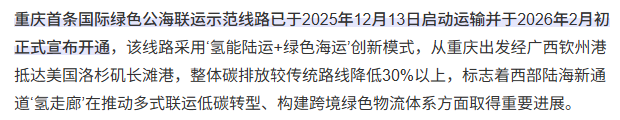 重慶首條國際綠色公海聯運示範線路正式開通,該線路自重慶無水港出發,經廣西欽州港中轉,最終抵達美國洛杉磯長灘港。線路創新採用 “氫能陸運 + 甲醇海運” 模式,重慶至欽州港 1150 公里公路段全程使用氫燃料電池重卡,海運段則啟用甲醇雙燃料集裝箱船,整體碳排放較傳統路線降低 30% 以上。這標誌著西部陸海新通道 “氫走廊” 在推動多式聯運低碳轉型、構建跨境綠色物流體系方面取得重要進展。