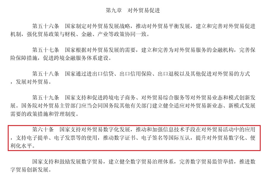 2026 年 3 月 1 日,新修訂的《對外貿易法》正式施行,這是該法 22 年來首次大修,首次將 “支持和鼓勵發展數字貿易” 寫入法律,明確三大核心方向:① 支持跨境電商行業發展,推動後續配套扶持政策落地;② 引導外貿全鏈條數位化升級,推廣電子提單、電子發票等數位化工具;③ 提升貿易便利化水準,推動電子簽名國際互認。該法為跨境電商數字化轉型提供了制度保障,助力中國外貿從 “貨物貿易” 向 “數字貿易” 升級。